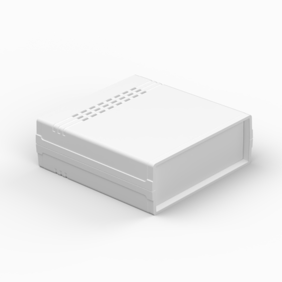 A flame retardant ABS enclosure with areation slots. Front and rear flame retardant panels. Base and cover have PCB mounting studs. Matt surface finish. Closing by two screws.