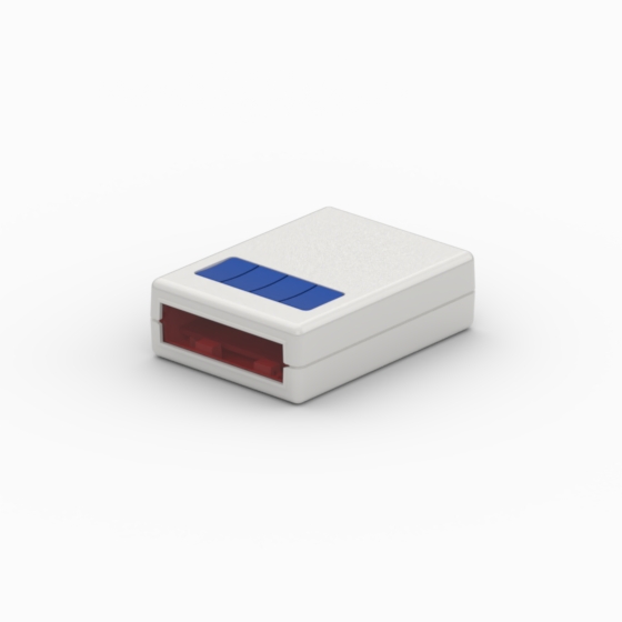 ABS enclosures with rounded corners. 9V battery compartment with a snap sliding lid. The model “10124” have one, two and four blue push-buttons set. The model “10005-DW1” have on the top a transparent window. The models “10005-B”, “10005-DW1” and “10124” have a front IR-panel replaceable by a plastic panel coloured as the box. Matt surface finish. Closing by only one screw. Upon request stainless steel clip (Mod. CL1).