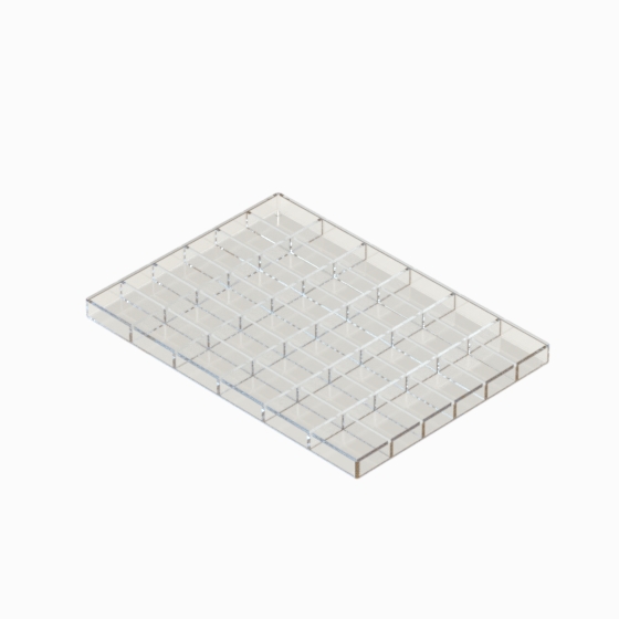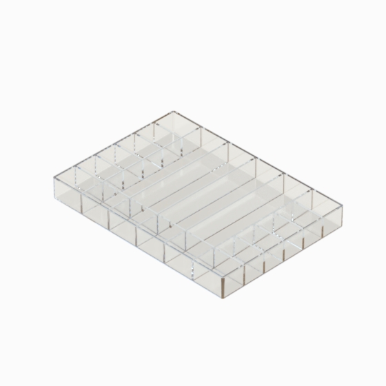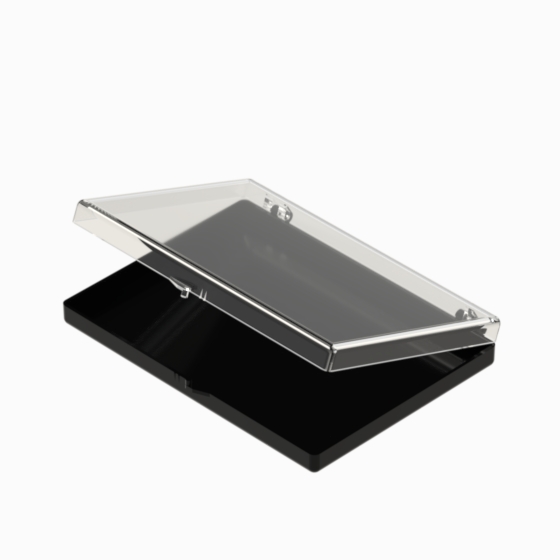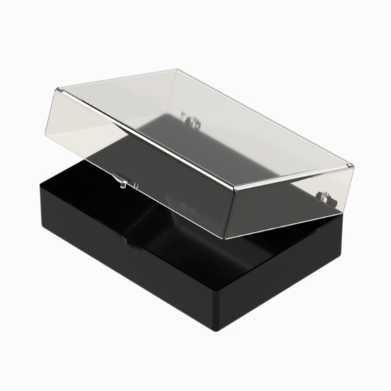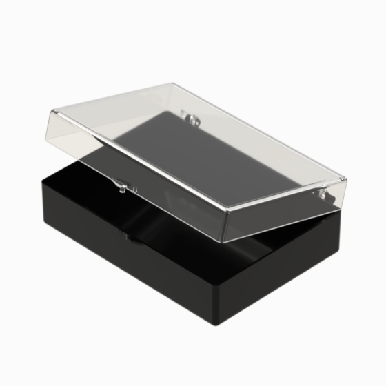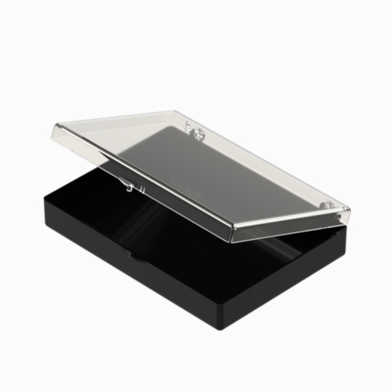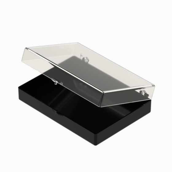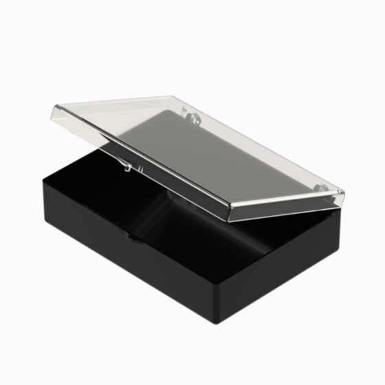 Series of small storage boxes with hinged transparent lid and black bottom. According with the internal dimensions could be utilised up to 3 trays that can be inserted inside, which are available in 20, 28 and 36 sections (Mod. SCA). They are moulded in polystyrene. Glossy surfaces finish.