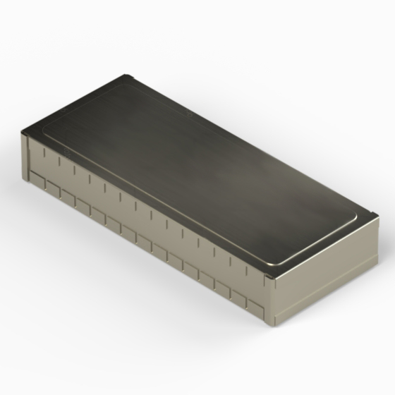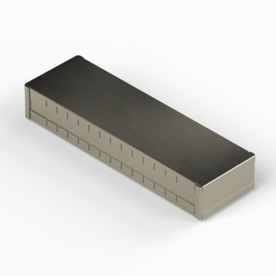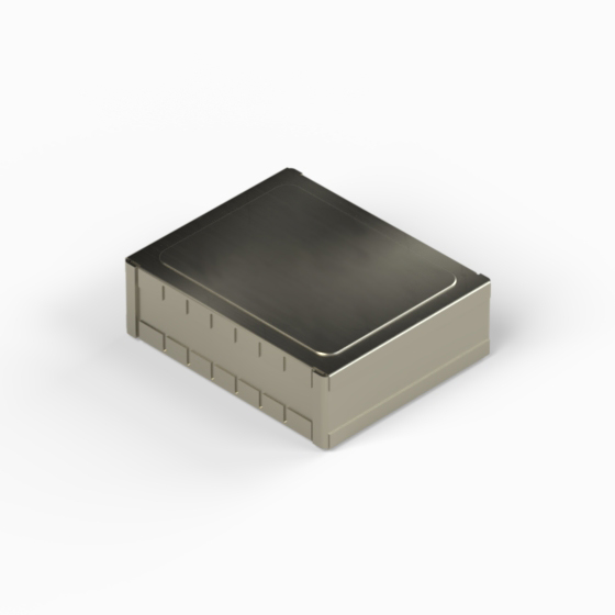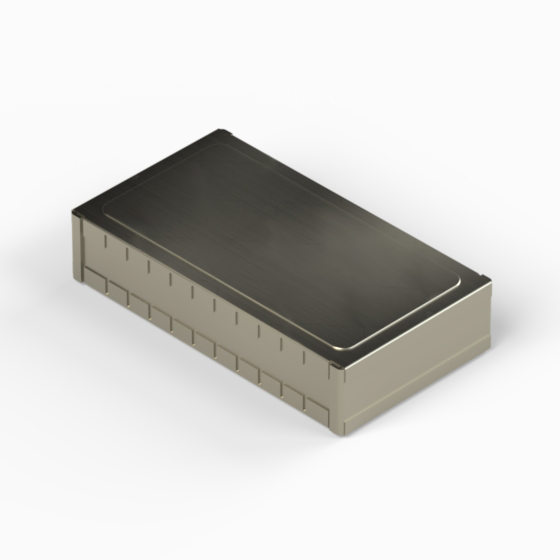 A hot tin-plated steel enclosure with two Snap-On, finger-flanged lids to allow access from top and bottom case.
