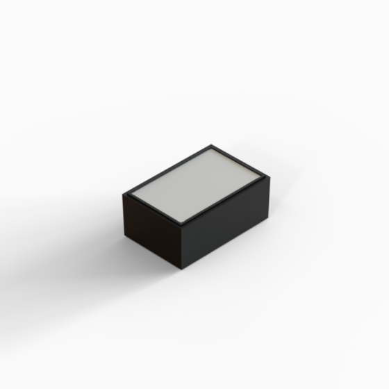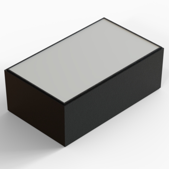 ABS enclosures with a plastic cover and an aluminium panel. Glossy surface finish. The cover has a recessed area to hold an 0.5 mm anodized aluminium panel. The base walls have integral PCB guides. Closing by four screws.