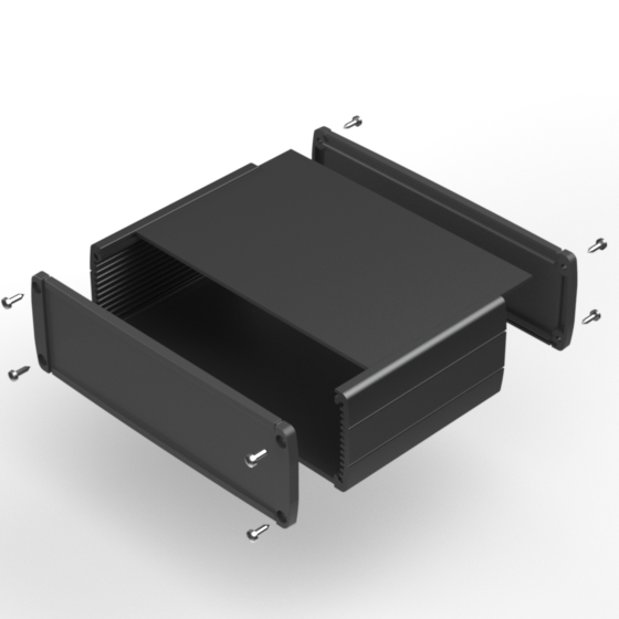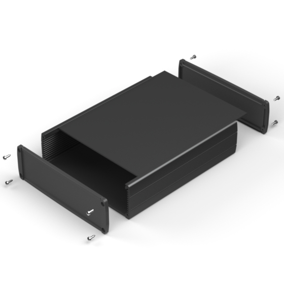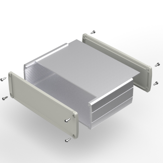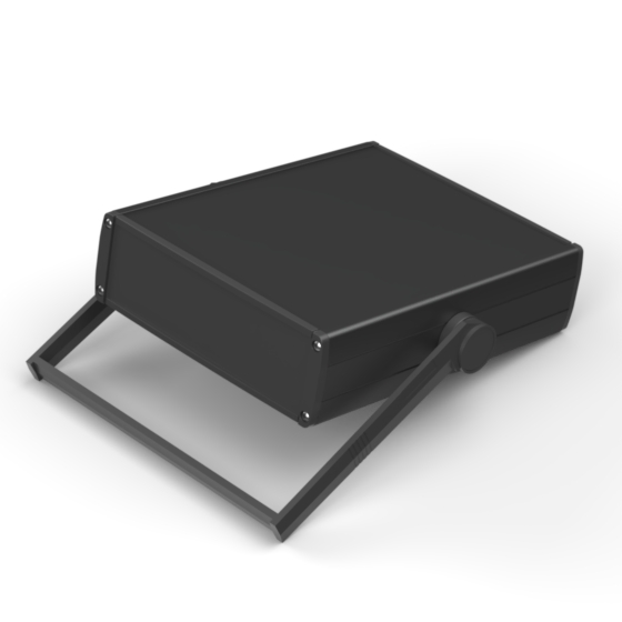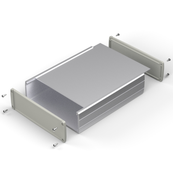 Contenitori in alluminio estruso con verniciatura esterna di elevato standard qualitativo dotati di pannello superiore in alluminio a slitta. Due pannelli frontali in ABS, guide interne per PCB. I modelli contrassegnati con “-H” sono dotati di maniglia inclinabile in otto posizioni. Due diverse lunghezze. Chiusura a otto viti.