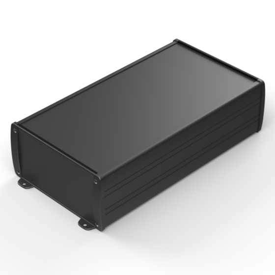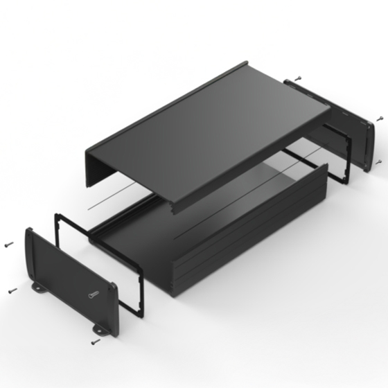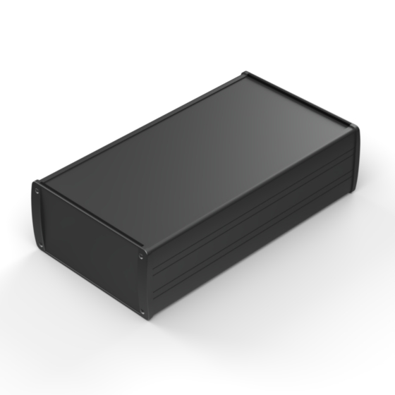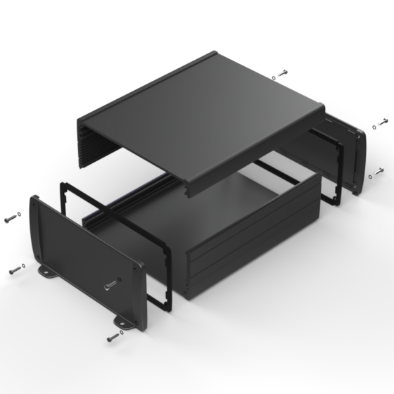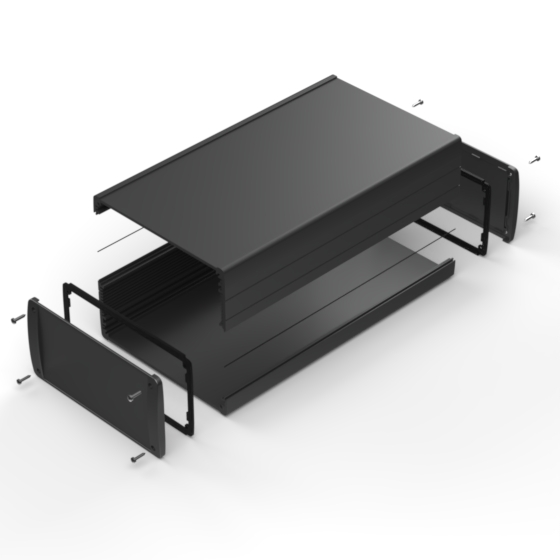 Contenitore in alluminio estruso con verniciatura esterna a polvere di elevato standard qualitativo. Due pannelli frontali in metallo, guarnizioni in gomma per protezione da acqua e polvere (IP65), guide interne per PCB e parte superiore con area ribassata per l’alloggiamento di una tastiera a membrana. I modelli con “-E” sono dotati di pannelli in metallo flangiati per montaggio a parete. Chiusura a otto viti.